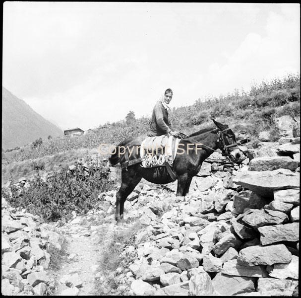Donna in posa in sella a un mulo: al lavoro nei campi di segale