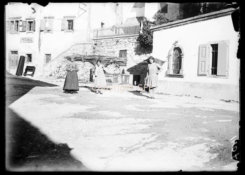 Tre donne nel paese di Pesariis portano sulle spalle delle gerle una delle quali con fascine di legna