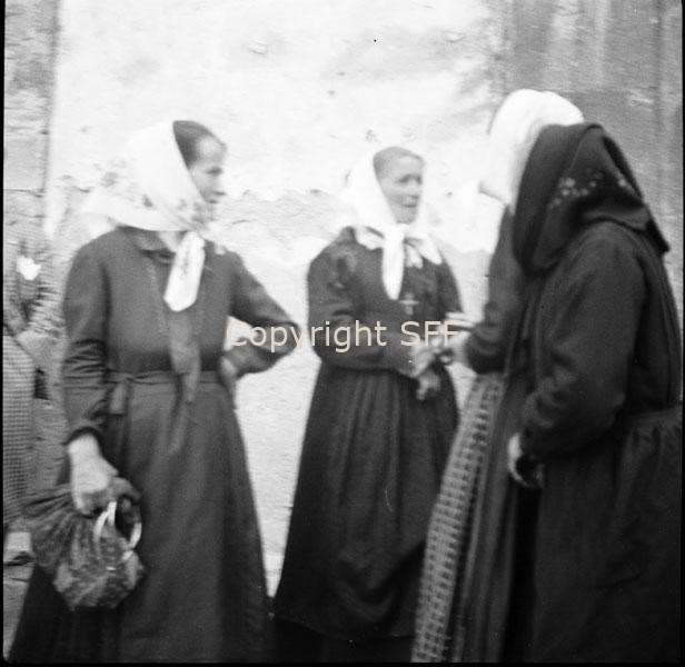 Donne in costume festivo a Casteldelfino chiacchirano dopo la messa