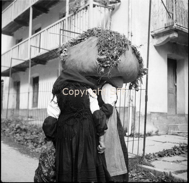 Donne in costume: l'una con carico di fieno nel lenzuolo