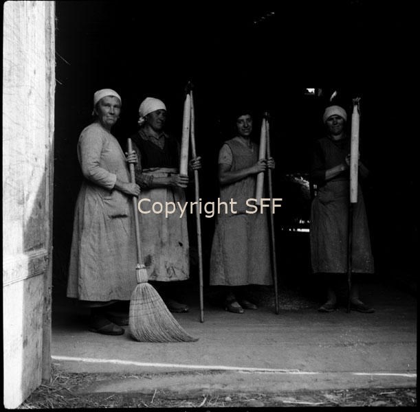 Ritratto di donna con scopa di saggina e di tre donne con in mano coreggiati utilizzati per la battitura del fieno