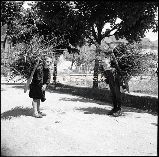 Due bambini con gerlino da legna