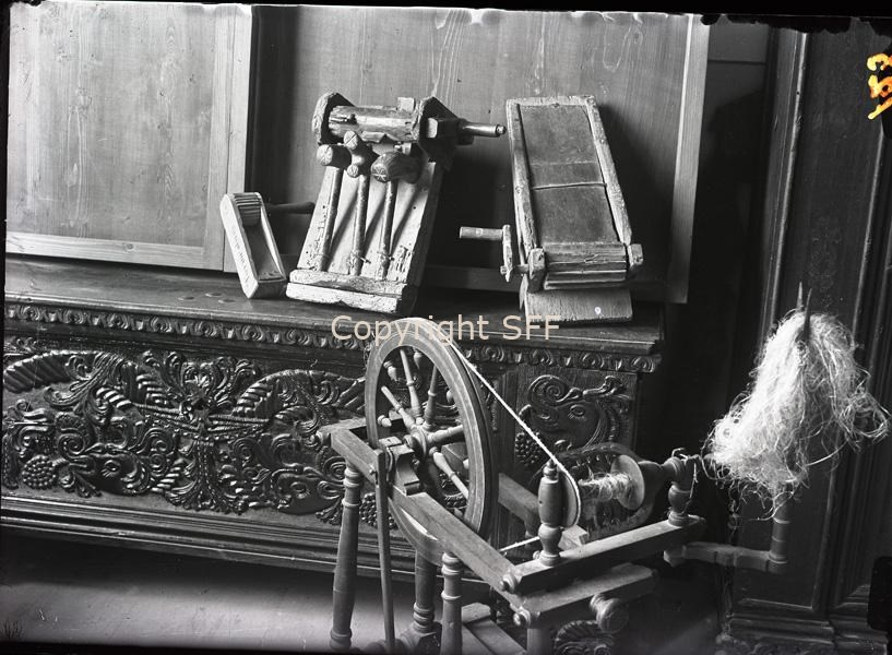 Esposizione di oggetti di uso quotidiano quali una raganella, un'arca e un mulinello in legno conservati presso il Museo Carnico delle Arti popolari "Michele Gortani" di Tolmezzo