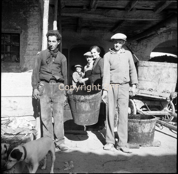 Famiglia in posa con bigonce e un carro carico d'uva