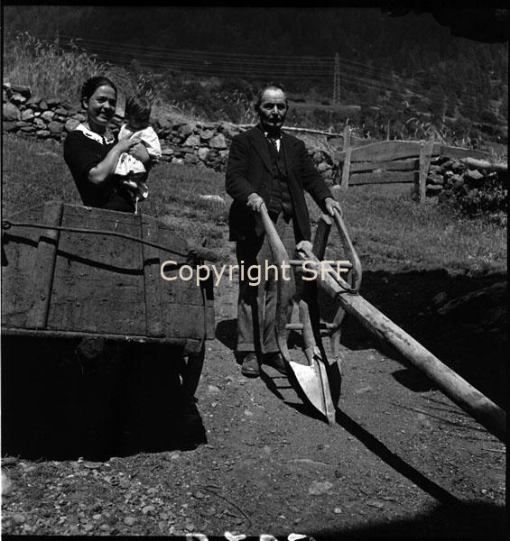 Famiglia in posa con un aratro ripreso dalla parte anteriore