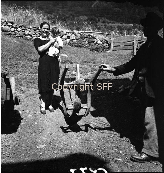Famiglia in posa con un aratro ripreso dalla parte posteriore