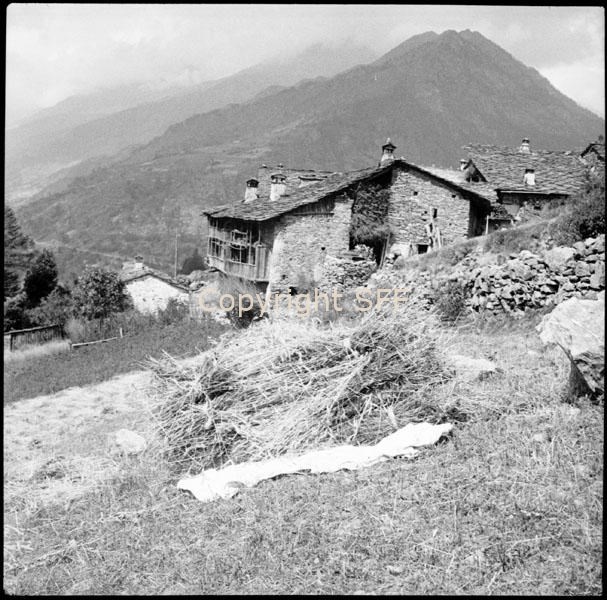Fasci di spighe e lenzuolo da trasporto in Borgata Bertines a Casteldelfino