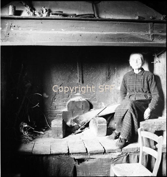 Focolare in muratura con alari in pietra; a fianco: ritratto di donna anziana