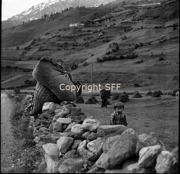 Gerla con lenzuolo da trasporto carico di fieno
