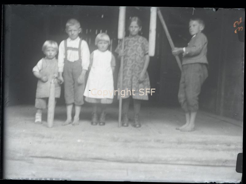Gruppo di bambini con correggiati per battere il fieno