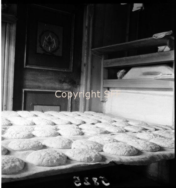Impasti di orzo, di grano e di segale da infornare: sullo sfondo la stufa di casa