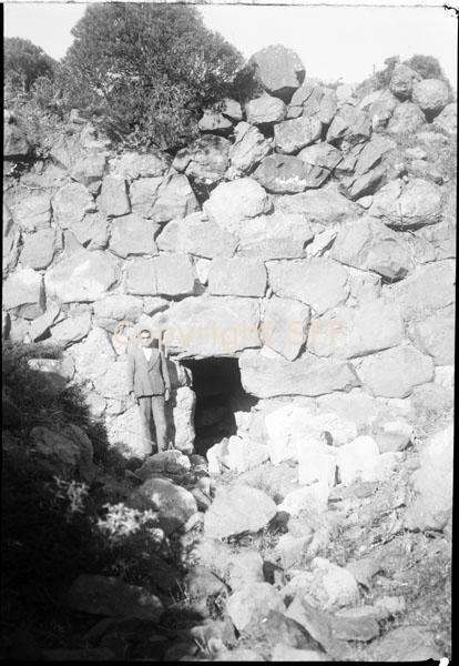- Nuraghe, ingresso: sono delle torri di forma tronco-conica, costruite con blocchi di pietra sovrapposti a secco, senza malta, tenuti insieme dal loro stesso peso. Il muro circolare può avere in certi casi lo spessore di quattro o cinque metri, la circonferenza esterna varia dai trenta ai cinquanta metri alla base. Diminuisce a mano a mano che aumenta l'altezza. Quelli meglio conservati possono essere alti dieci o quindici metri. Una bassa apertura immette in un locale interno, fornito di nicchie aperte nella parete, e talvolta una scala a chiocciola interna, ricavata nello spessore del muro, conduce a un locale superiore. I più semplici hanno un'entrata architravata che introduce a un corridoio pieno zeppo di nicchie, che porta al salone principale, di forma circolare, comunicante i piani più alti. Servivano come fortilizi, abitazioni fortificate, posti di vedetta, qualcosa come i castelli medievali dove, in caso di pericolo si rifugiava la popolazione sparsa nei dintorni.