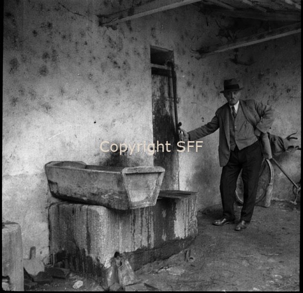 Interno a Balocco: uomo in posa accanto a un trogolo a pompa con abbeveratoio di legno