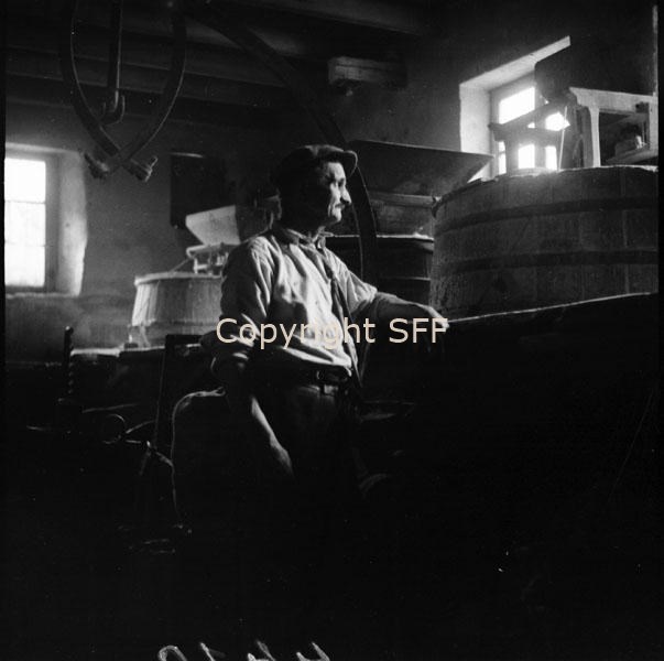 Interno di mulino a Candia Canavese: mugnaio in posa davanti alle macine