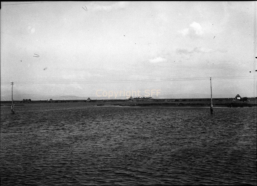 - Veduta della laguna di Grado; sullo sfondo i casoni, tipiche costruzioni locali
