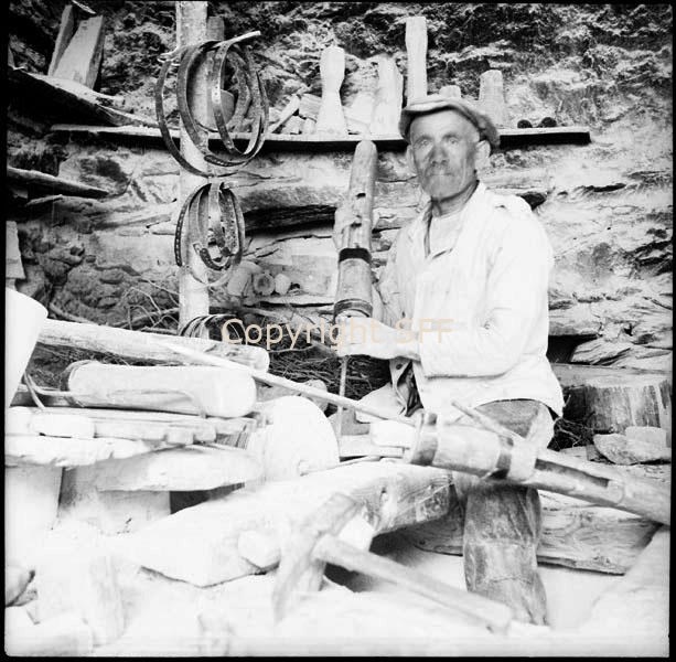 Ritratto di scalpellino con lo scalpello in mano mentre lavora la pietra ollare