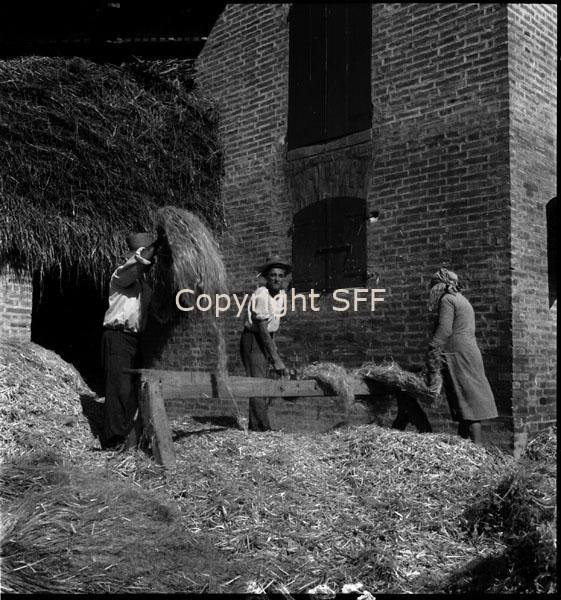 - Coppia di uomini ripresi mentre scotolano la canapa: l'operazione consiste nell’asportare i residui legnosi rimasti attaccati alle fibre dopo la maciullatura