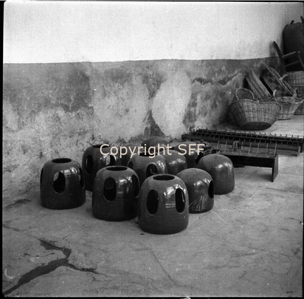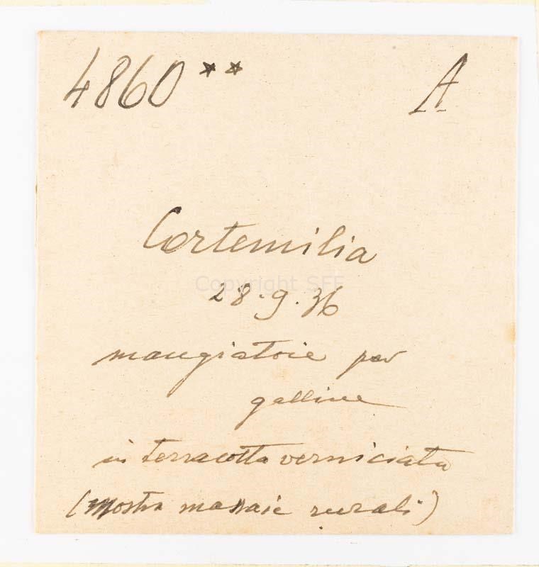 Mangiatoie per galline in terracotta verniciata esposte in mostra