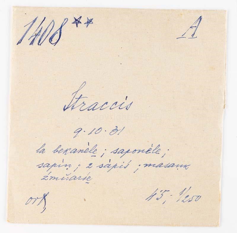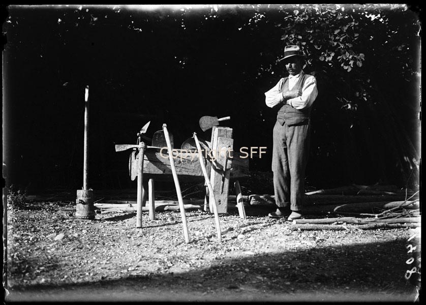 - Un uomo circondato da una serie attrezzi: un martinetto (bacanele) in legno a due o tre manici usato per spianare il terreno negli squeri; un sarchiello (saponèle); un zappino (sapìn) usato principalmente per rimondare gli ortaggi; due zappe (sàpiś); un pennato (masank) strumento a lama larga e un po’adunca con manico corto di legno utilizzato per tagliare rami d’albero o legna da ardere e una morsa (źmŭarśe)