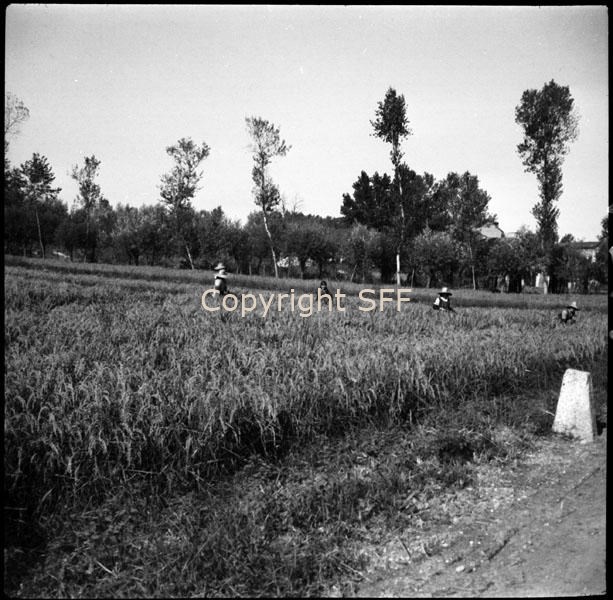 Mietitura del riso: donne al lavoro con i caratteristici cappelli parasole