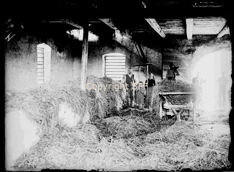 Nella stalla: famiglia in posa con attrezzi del lavoro agricolo
