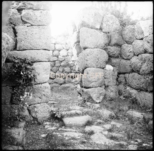 - Particolare di una costruzione nuragica sulla Giara di Serri: la Giara di Serri è considerata di grande importanza dagli archeologi perché ospita il villaggio-santuario di Santa Vittoria , il Pantheon delle memorie nuragiche. Si pensa che nell'edificio principale del villaggio si riunissero in assemblee federali i clan più potenti dei nuragici abitanti la Sardegna centrale, per consacrare alleanze o per decidere guerre.