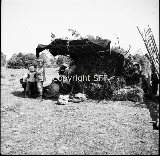 Persone e covoni al riparo sotto una tenda
