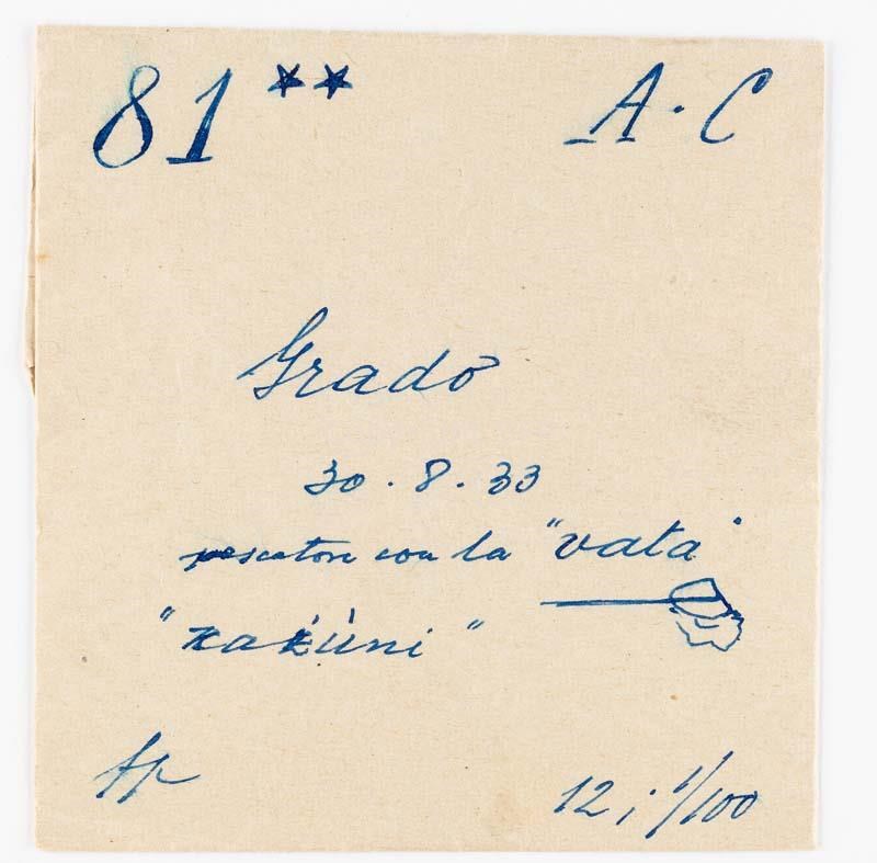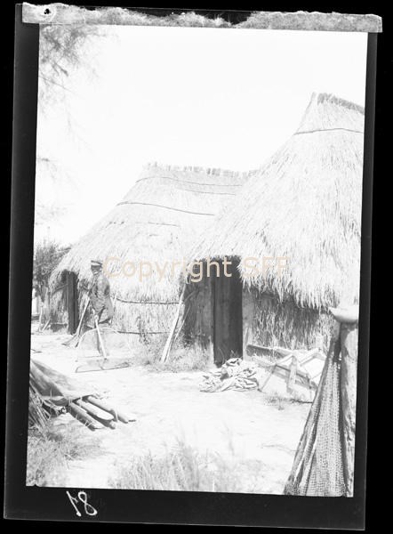 Pescatore con la "vata" accanto ad un casone a Grado