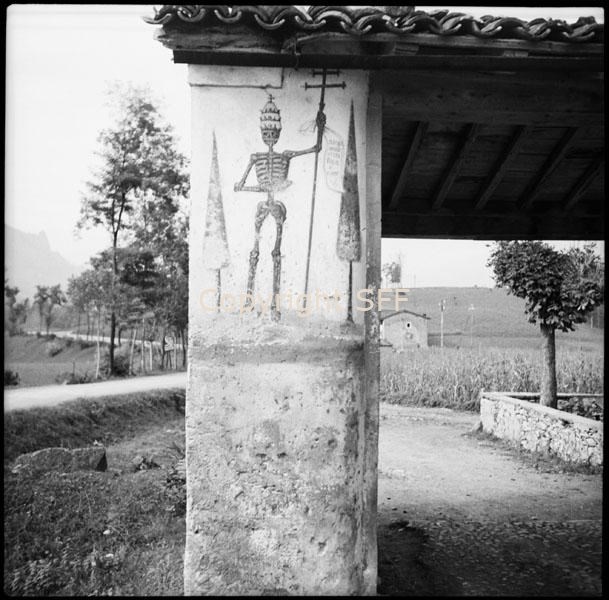 - Affresco su pilastro raffigurante uno scheletro che indossa la tiara papale; a lato della figura la scritta "nacqui grande vissi papa morsi" e una data relativa alla pestilenza del 1630