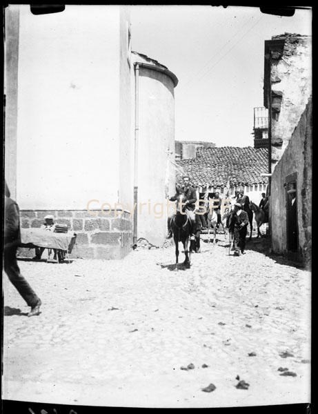 - Processione di uomini a cavallo lungo le strade del paese durante la festa dei santi Raffaele e Giorgio: il corteo intorno alla chiesa