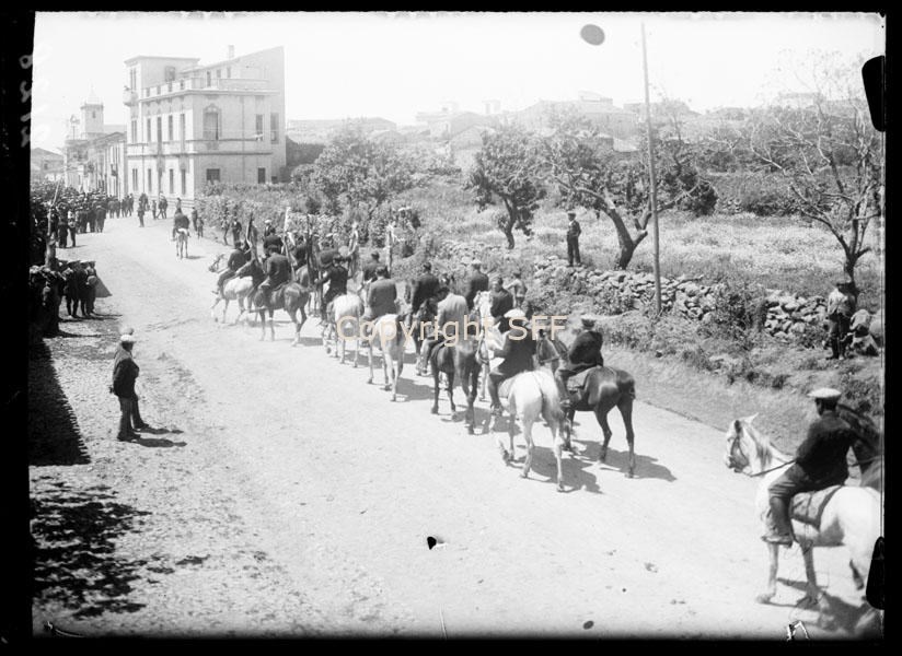 Processione di uomini a cavallo lungo le strade del paese durante la festa dei santi Raffaele e Giorgio