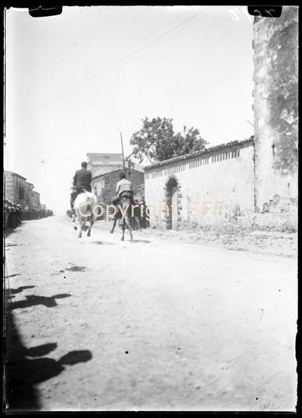 - Processione di uomini a cavallo lungo le strade del paese durante la festa dei santi Raffaele e Giorgio: due cavalieri uno dei quali è un ragazzo