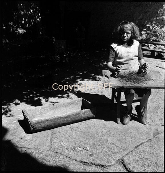 Ragazza in posa con strumenti del lavoro domestico: trogolo, tagliere e mezzaluna