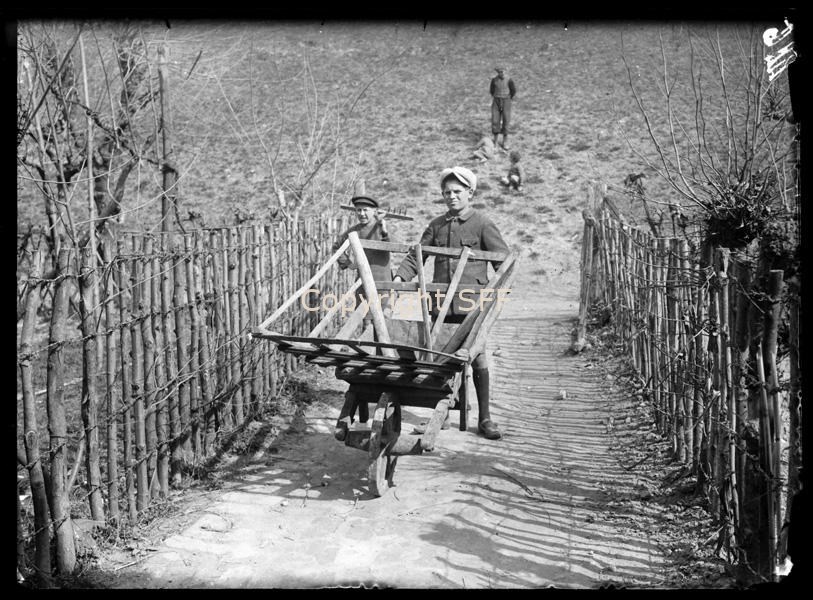 Ragazzo con carriola per la raccolta di fronde e fogliame