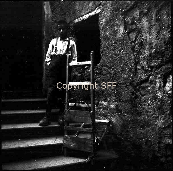 Ragazzo in posa accanto a un attrezzo da trasporto a spalla