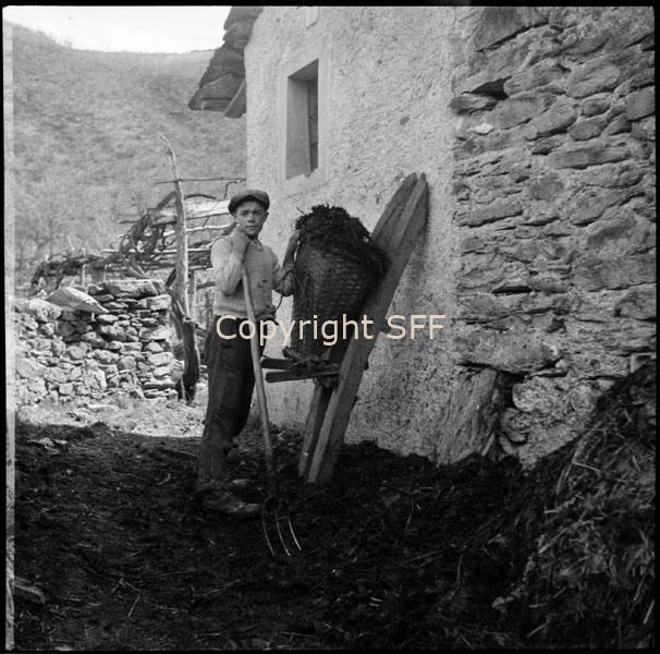 Ragazzo in posa con strumenti del lavoro agricolo