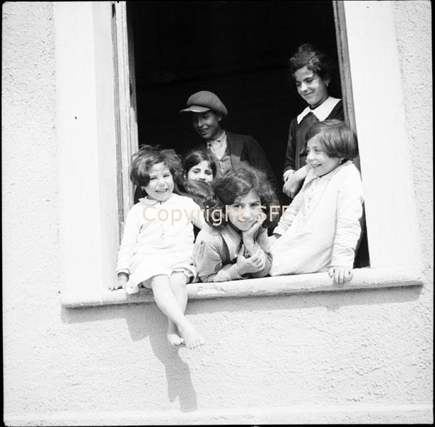 - Ritratto di gruppo di bambini di diverse età affacciati ad una finestra