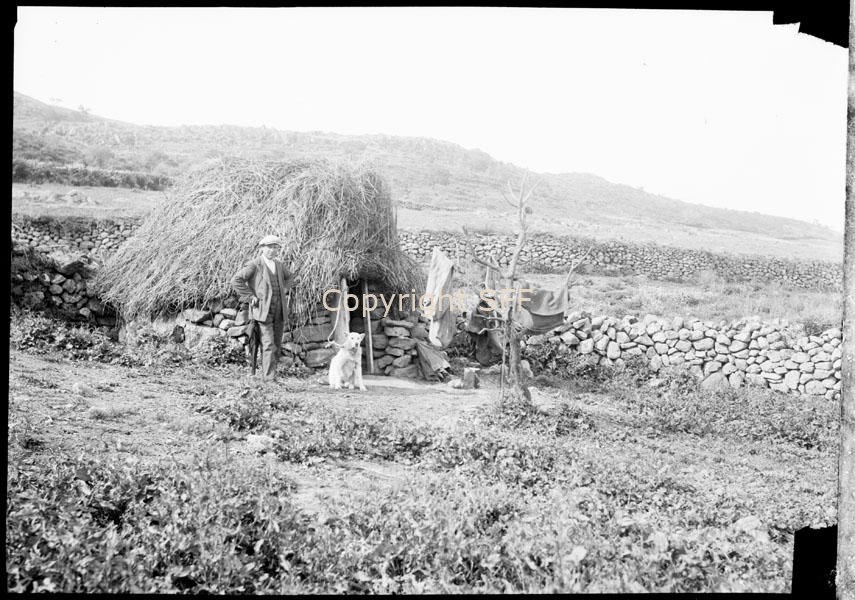 - Baracca costruita con la tecnica del muro a secco e con copertura vegetale utilizzata come riparo per il pastore e/o per le pecore; all'esterno ritratto dell'informatore