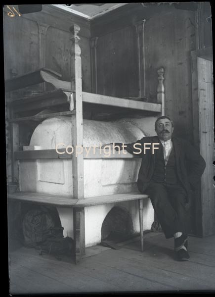 Ritratto dell'informatore Arturo Dell'Osta a Padola accanto alla stufa di casa