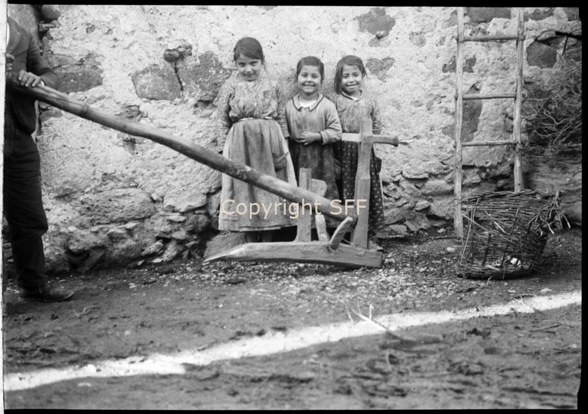 Ritratto di bambine con aratro in legno