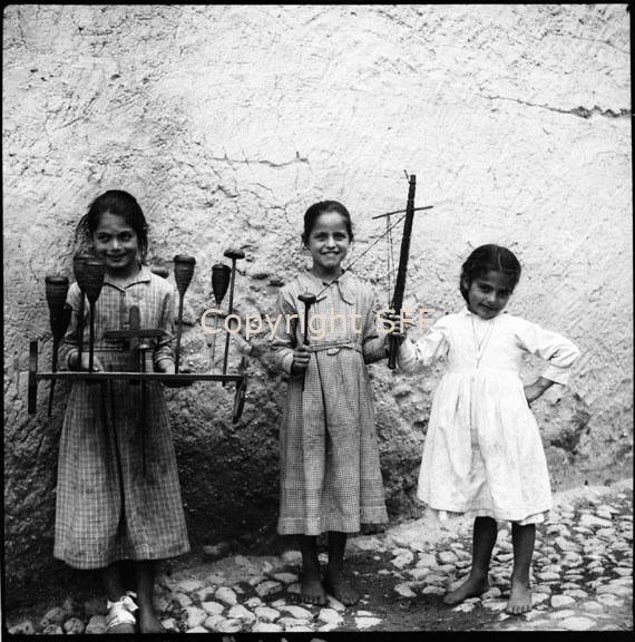 Ritratto di bambine con attrezzi per la filatura