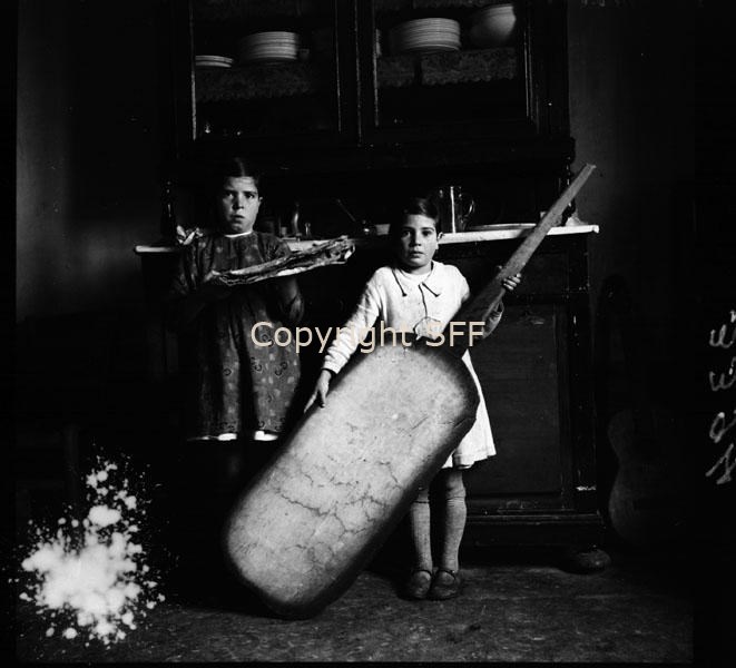 Ritratto di bambine con pala per infornare il pane