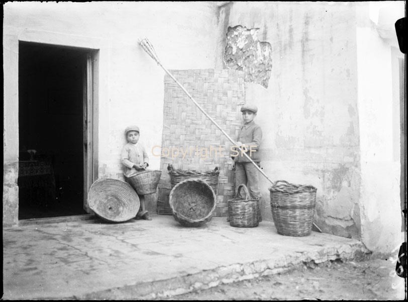 - Cesti di vimini di diverse dimensioni e usi, stuoia di canna appoggiata alla parete, canna di materiale vegetale utilizzata per la raccolta dei fichi