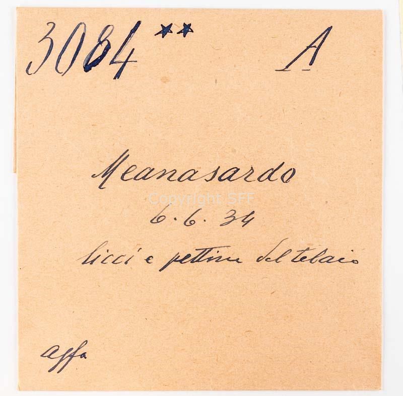 - Telaio in legno e particolari; licci: elementi dei telai per tessitura, la cui funzione consiste nell’innalzare o abbassare i fili dell’ordito per consentire il passaggio della navetta che porta la trama; pettine: organo del telaio formato da una serie di dentelli paralleli che dividono i fili dell’ordito e serrano la trama