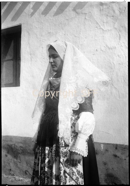 - Ragazza che indossa il costume da sposa: gonna rossa, fondo blu e oro; grembiule verde con lembo di damasco; fazzoletto al collo blu e rosso; cintura d'argento; giacca (ğippòni) zuava nera; fazzoletto di merletto in testa, sotto di questo: sa-skòffĭa (rossa); collana d’oro (kannòkka) come ornamento