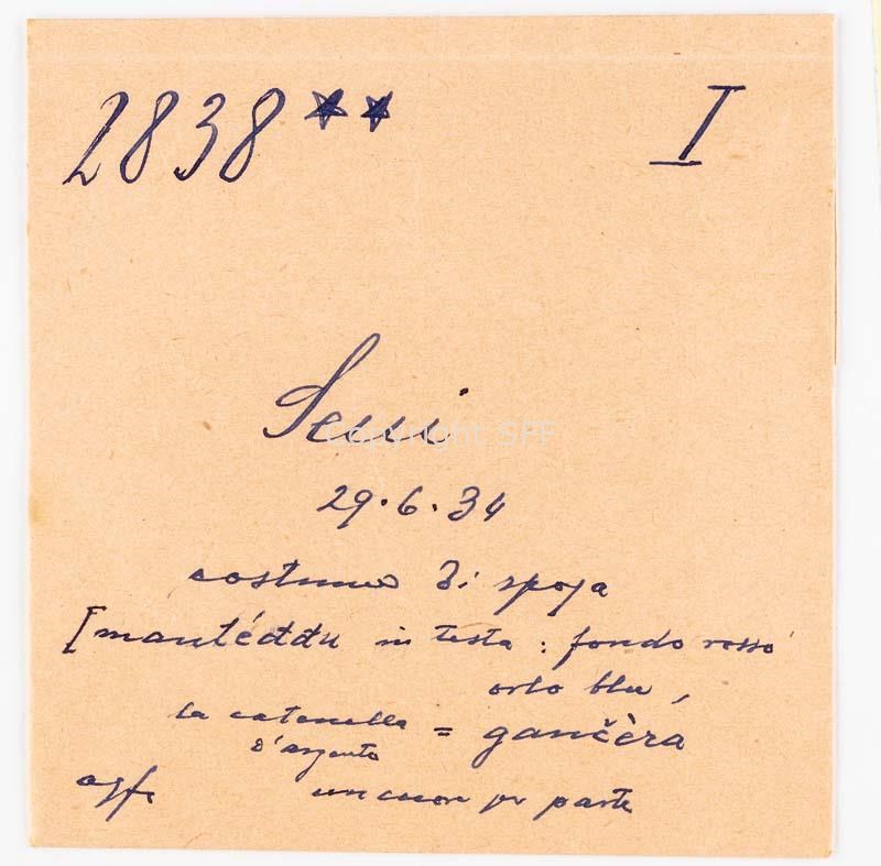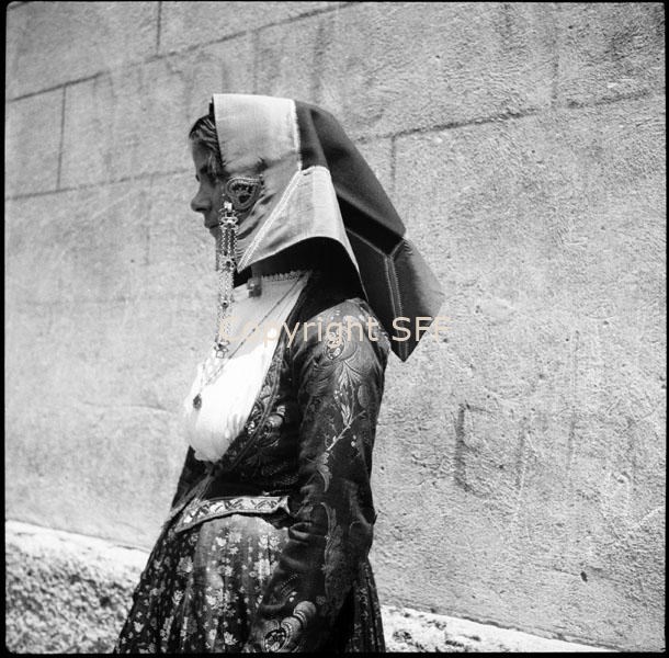 - Abito da sposa; fazzoletto sulla testa (fondo rosso, orlo blu); catenella d'argento fissata con un cuore