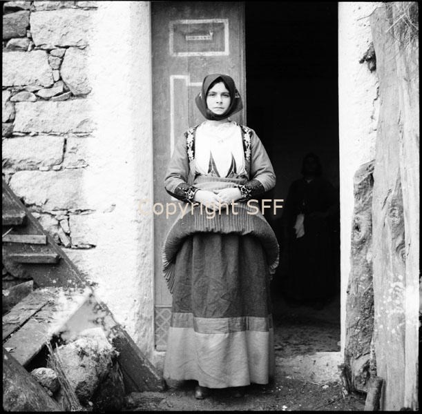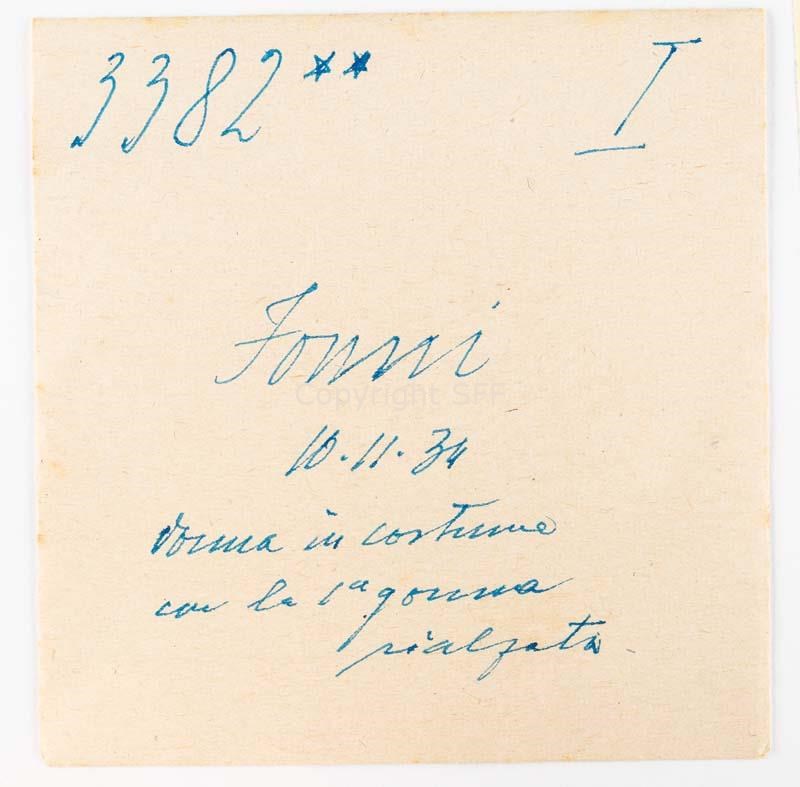 - Ritratto di donna che indossa il costume locale; tiene la gonna rialzata per mostrare la parte sottostante dell'abito
