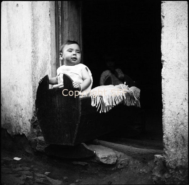 Ritratto di infante dentro una culla in legno
