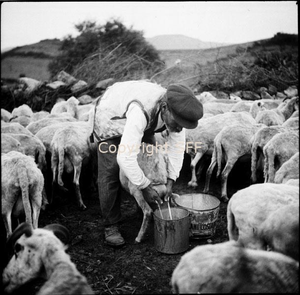 - Pastore che munge le pecore con una particolare tecnica all'interno del recinto (mandra)