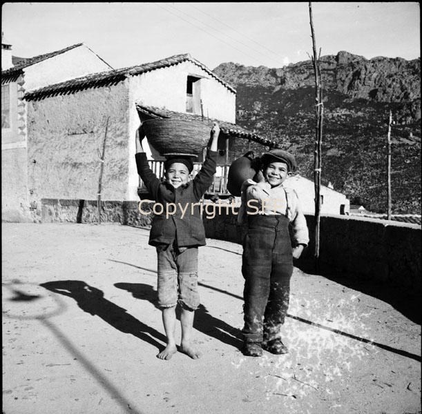 Ritratto di ragazzi con paniere sulla testa e con brocca in mano